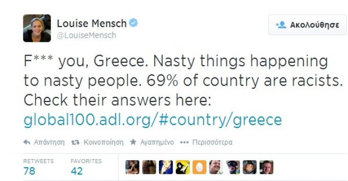 Η πρώην βουλευτής του Συντηρητικού Κόμματος στη Βρετανία, έγραψε στο twitter: "Άντε γαμ... Ελλάδα. Κακά πράγματα συμβαίνουν σε κακούς ανθρώπους. Το 69% είναι ρατσιστές" κι όπως ήταν αναμενόμενο άναψε "φωτιές" στον προσωπικό της λογαριασμό, με τις απαντήσεις, πολλές εκ των οποίων από Έλληνες, να είναι δεκάδες.Το επίμαχο tweet της Louise Mensch - Φωτό - Twitter