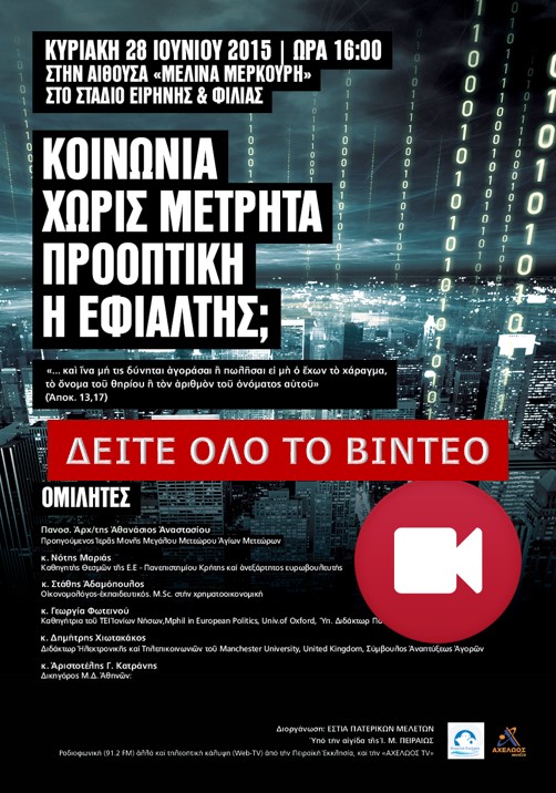 AFISA AXRIMATI KOINONIA VIDEOΤήν Κυριακή 28/6/15 ἡ Ἑστία Πατερικῶν Μελετῶνὑπό τήν αἰγίδα τῆς Ἱερᾶς Μητροπόλεως Πειραιῶςστό Στάδιο Εἰρήνης καί Φιλίας (Σ.Ε.Φ.) καί στήν αἴθουσα Μελίνα Μερκούρη, ὀργάνωσε Ἡμερίδα μέ θέμα Κοινωνία χωρίς μετρητά. Προοπτική ἤ ἐφιάλτης;