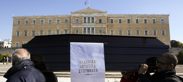 Μάλιστα σε μία προσπάθεια να εκφράσουν την αγανάκτηση τους υπερέβαλαν, αφού έφεραν ένα φέρετρο με κορδέλα «Αμυντικά Συστήματα» έξω από τη Βουλή.