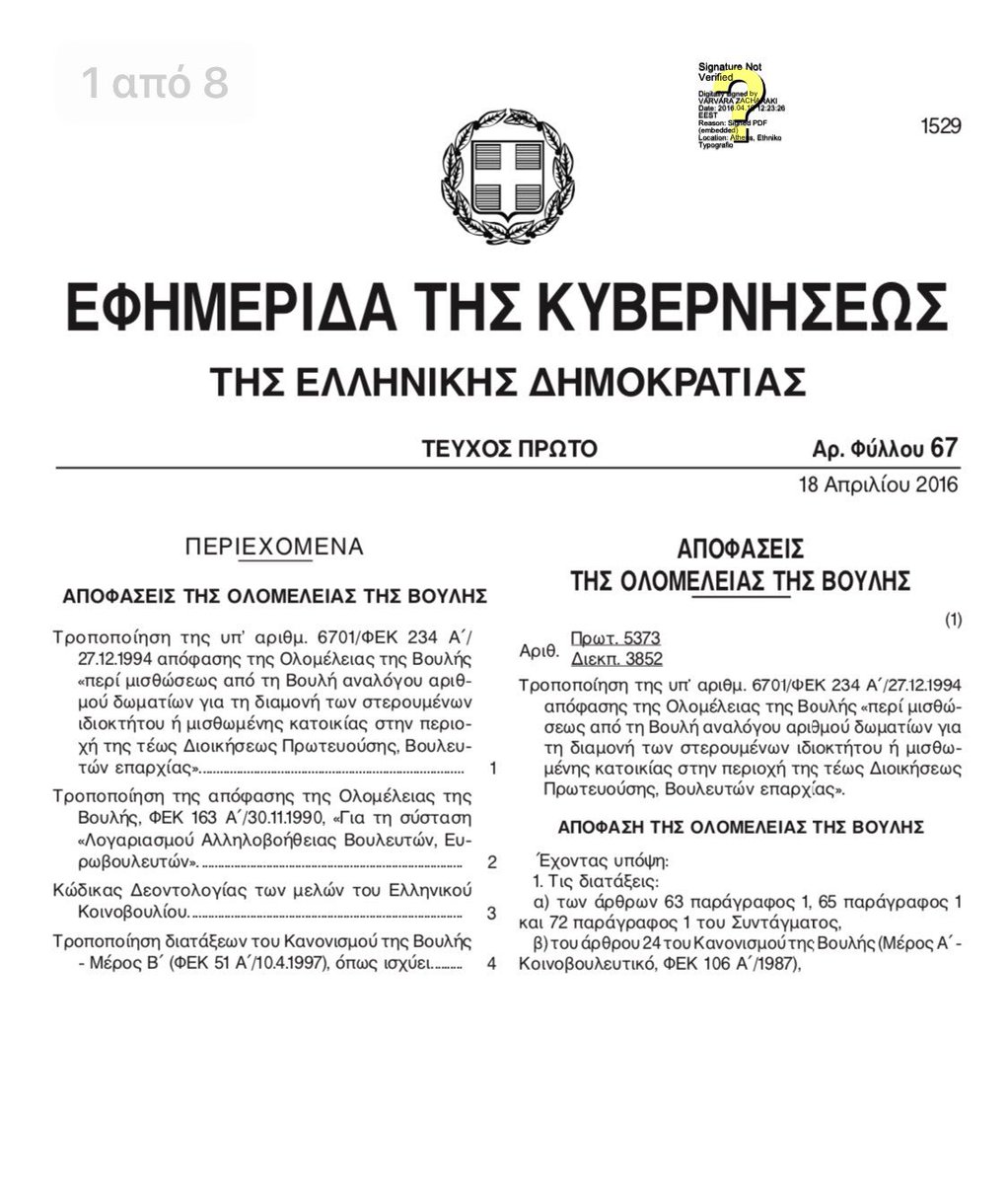 Η Εφημερίδα της Κυβερνήσεως και το άρθρο 4 με τις προβλέψεις για τα δώρα σε βουλευτές: