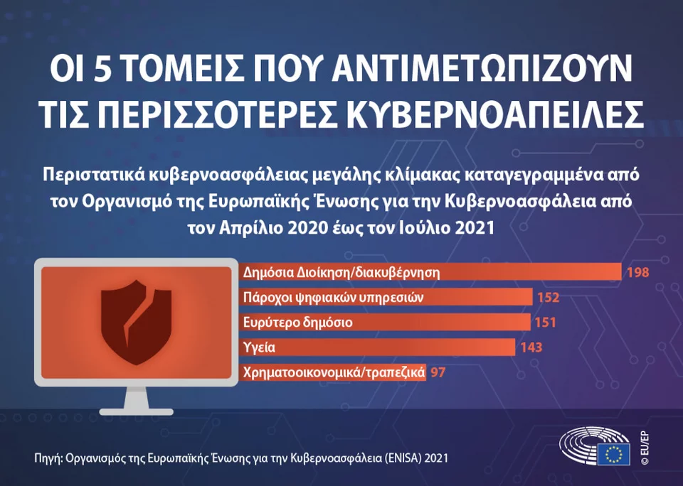 Οι απειλές κατά της κυβερνοασφάλειας στην Ευρωπαϊκή Ένωση επηρεάζουν τομείς ζωτικής σημασίας για την κοινωνία. Σύμφωνα με την έρευνα του Οργανισμού της Ευρωπαϊκής Ένωσης για την Κυβερνοασφάλεια (ENISA) που διεξήχθη από τον Απρίλιο του 2020 έως τον Ιούλιο 2021, οι πέντε τομείς που αντιμετωπίζουν τις περισσότερες απειλές είναι η δημόσια διοίκηση/διακυβέρνηση (198 περιπτώσεις), οι πάροχοι ψηφιακών υπηρεσιών (152 περιπτώσεις), το ευρύτερο δημόσιο (151 περιπτώσεις), η υγεία (143 περιπτώσεις) και ο χρηματοοικονομικός/τραπεζικός τομέας (97 περιπτώσεις).